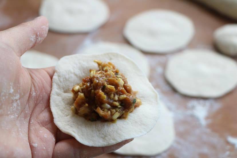 9、取一个饺子皮,包上适量馅料;