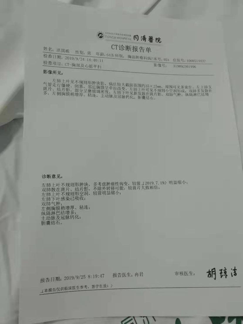 想起了十个月前,医生诊断肺癌晚期并告知中位生存期只有十个月。当时真是慌乱又害怕。现在一晃十个月过去了,药物作用显著,父亲状态不错,感到非常的庆幸。期待有CR的一天呢。