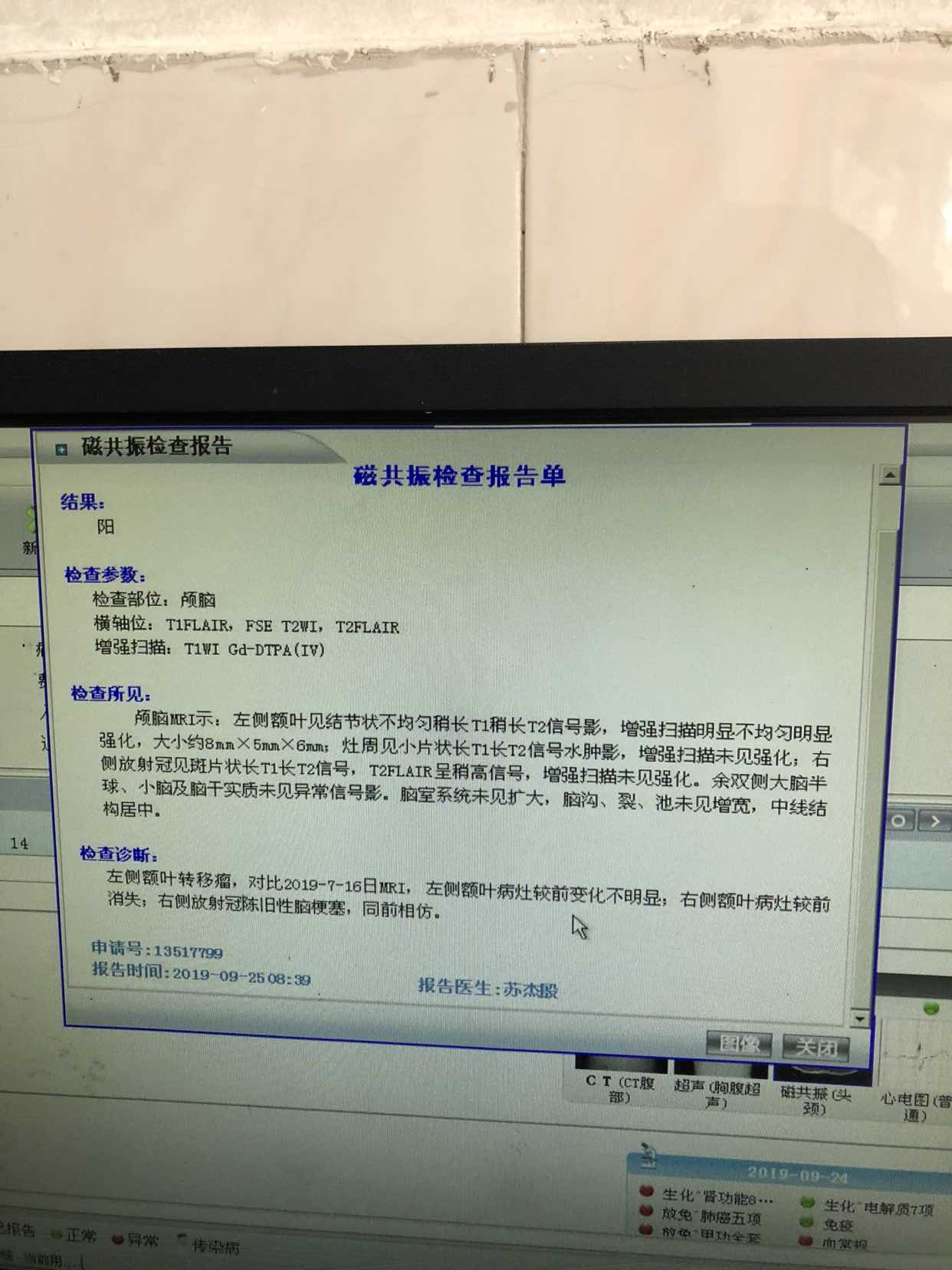 紧张的心情随着赖教授带来的好消息被瞬间击退,ct主任在我爸做完ct后告诉教授,肿瘤进一步缩小,虽然幅度没有上次那么大。教授马上过来告诉我们,又带着我去了核磁共振办公室跟着医生一起看了片,脑部原来做过伽玛刀的病灶接着稳定,有钙化倾向,上次复查的新增可疑灶也不见了!永远记住80多岁赖教授一边下楼梯一边跟楼梯下的我喊好消息的高兴劲,无以言谢,好人一生平安!带我看完核磁共振之后教授又亲自去了ct室和主任一起看了ct影像,打电话告诉我确认是好消息时亦是激动万分,真的谢谢您的各种细心与帮助🙏!