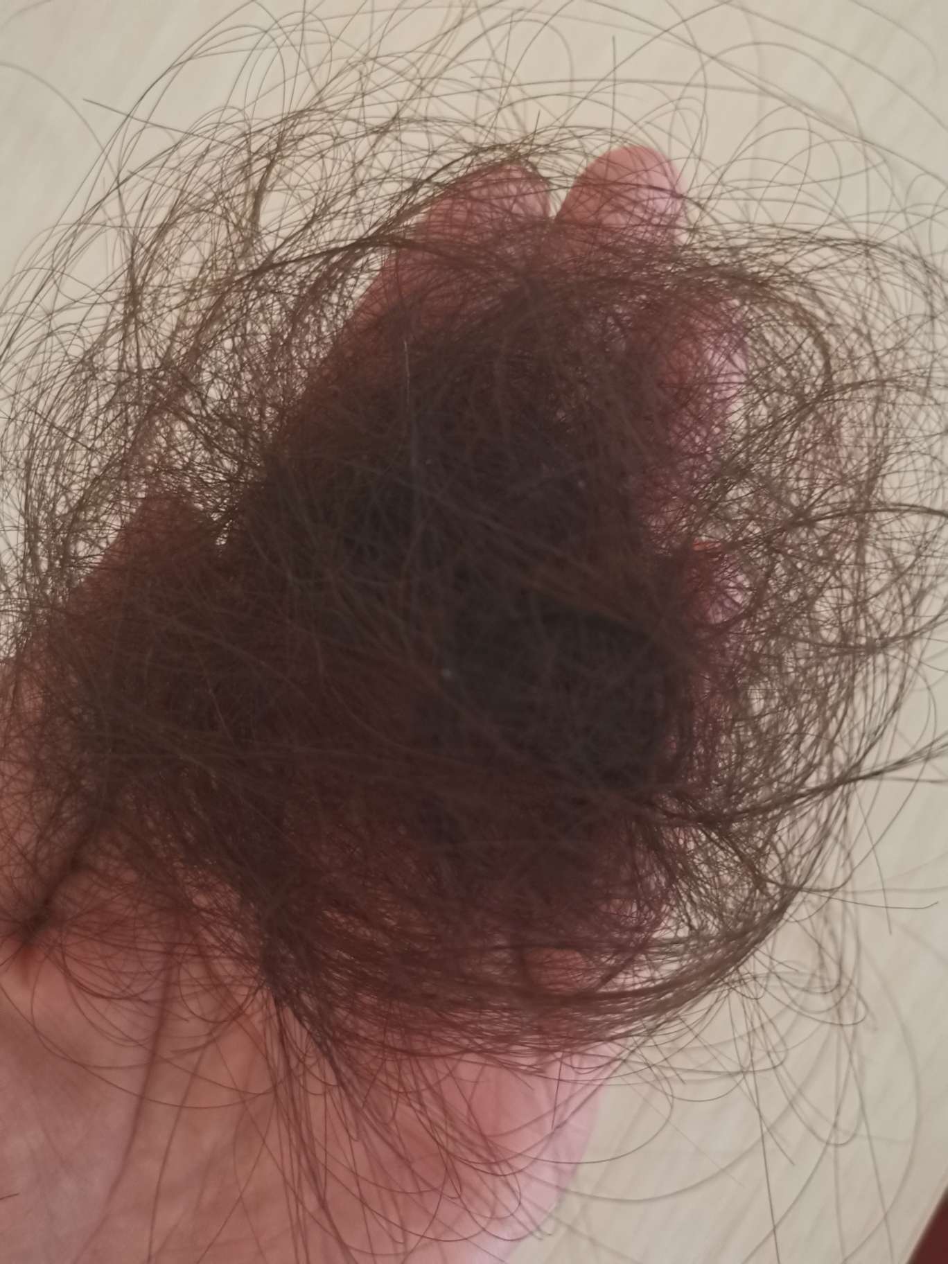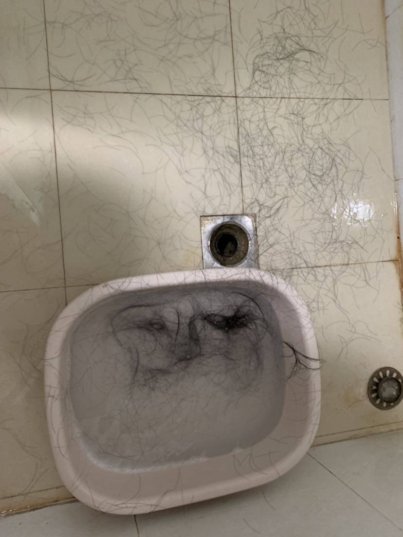 周化疗方案第四次昨天结束,但是脱发是从前天开始的,也就是说周化疗第三次开始脱发,一共要12次。已经完成了三分之一了。脱发是从一开始就有心理准备的,结果短发也掉的如此触目惊心。洗个澡,已经这个样子了……明天哥哥姐姐来,我最不想让他们看到,所以没有去理发店剃头。还没掉光,要不要留?还是每天难受一会会儿