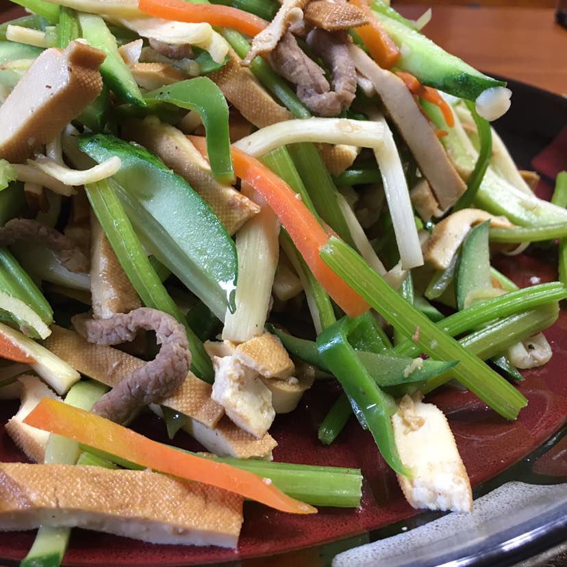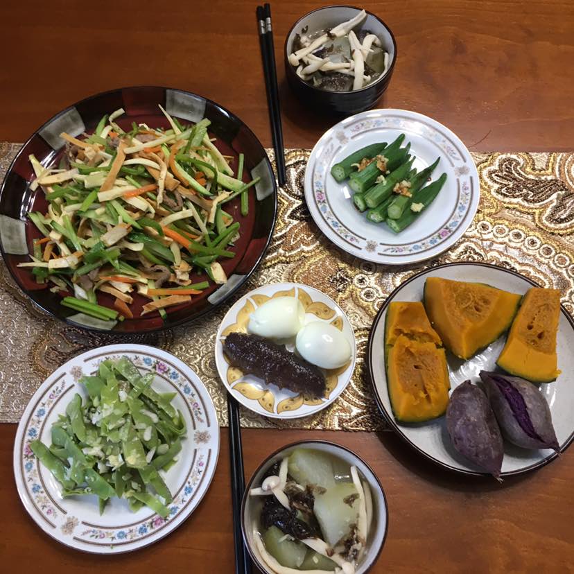 早餐:海参/水煮蛋/芹菜肉丝香干炒胡萝卜黄瓜/海鲜菇冬瓜紫菜汤/水煮秋葵/蒜拌猫耳朵/南瓜紫薯