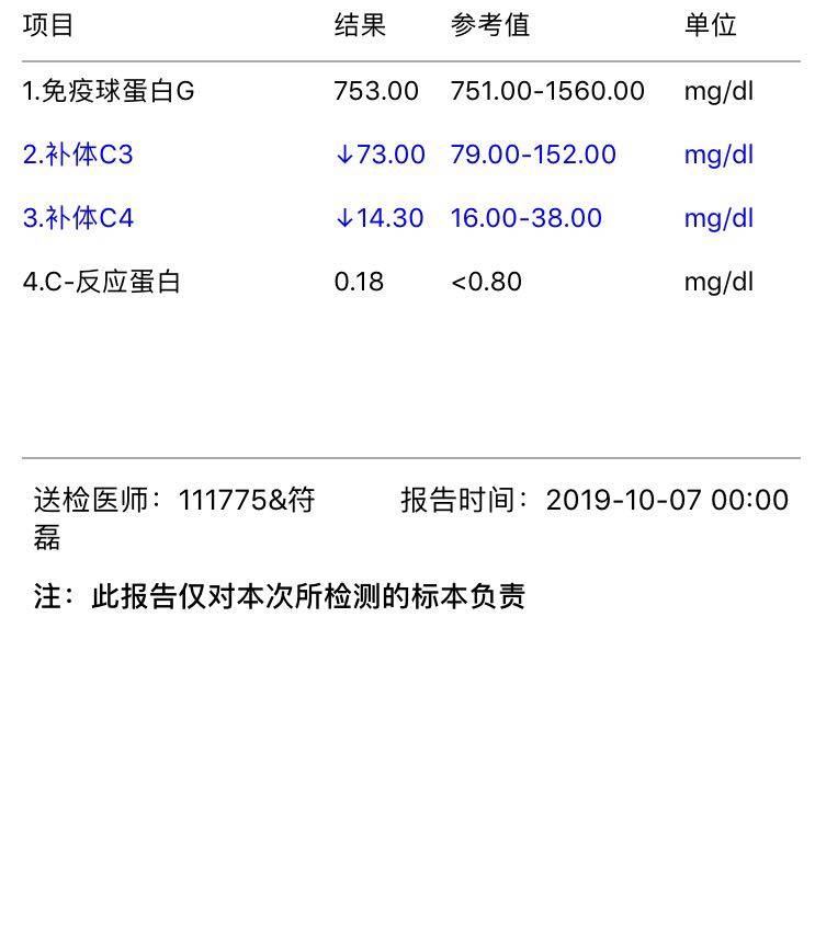 出院两个半月了,这个月补体偏低了,血尿常规肝肾功能正常,有点紧张🤪啊,这是不是说明有点小波动?后天去找主治医生看结果。上边的是今天的,下边是上个月的。