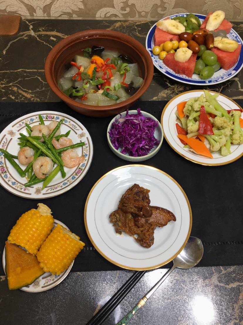 午餐:芦笋炒虾/菜花拌胡萝卜红椒/虾仁木耳冬瓜胡萝卜汤/紫甘蓝/酱肉/玉米/南瓜