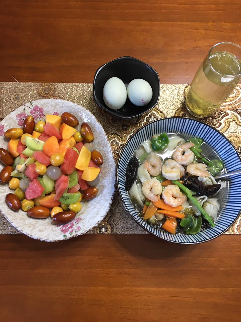 早餐:胡萝卜虾仁紫菜木耳芦笋青椒汤猪肉馄炖/百香果水/鸭蛋/水果拼盘