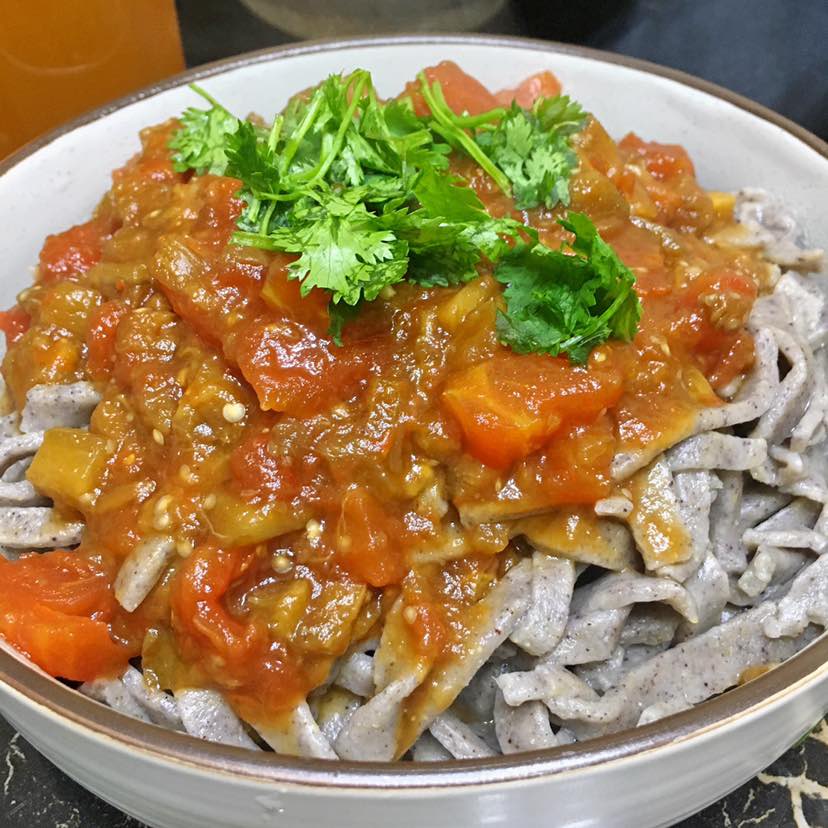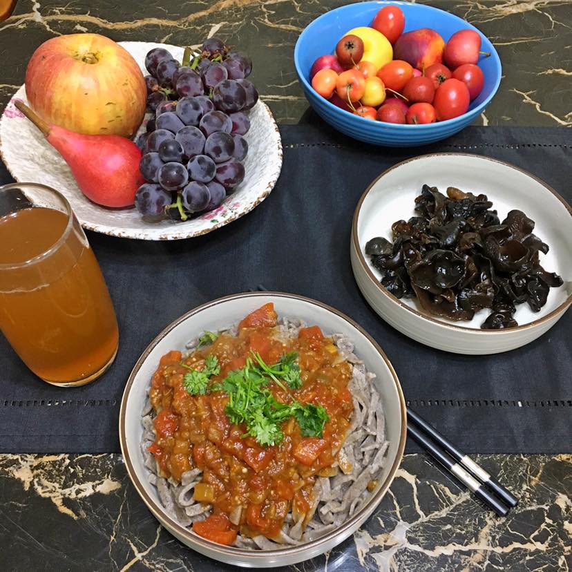 早餐:西红柿茄子杂粮打卤面/山楂水/橄榄油拌木耳/水果拼盘