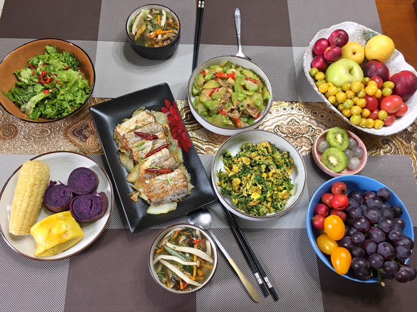 午餐:佛手瓜炒肉/蛋炒芹菜叶/拌生菜/带鱼烧白菜/蟹味菇黄瓜紫菜胡萝卜汤/紫薯玉米南瓜馒头