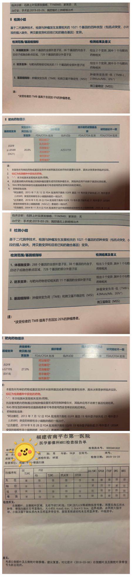 这是手术后的两颗肺腺癌基因检查报告,以及这次半年复查的核磁共振增强的报告,求助大家