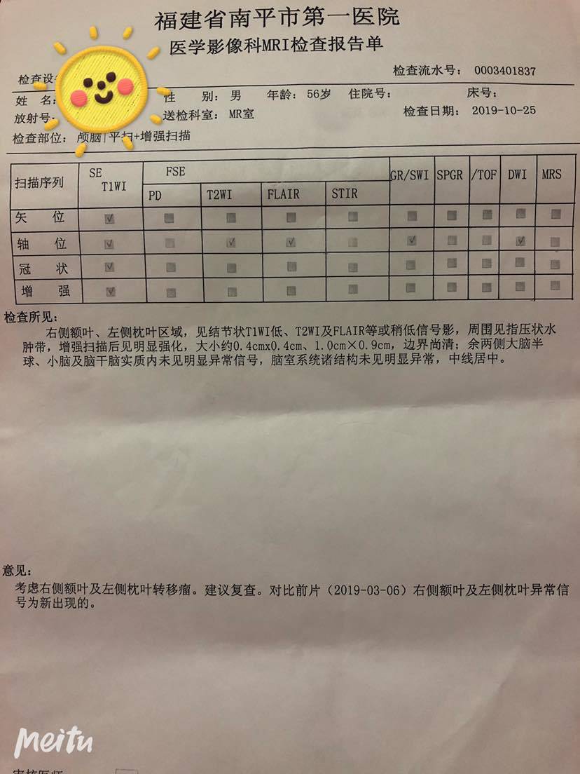 热心的校友又委托他的友人,帮我爸的核磁共振增强和所有报告发送给上海权威的放疗主任,主任答复两点:1、脑部的肿瘤不像是肺部转移瘤,而且两颗也不似相同,有可能是脑部双原发肿瘤,要做petct进一步确诊。2、肺腺癌1A2期手术后7个月脑转,概率太小,不能仓促用上三代奥希替尼。