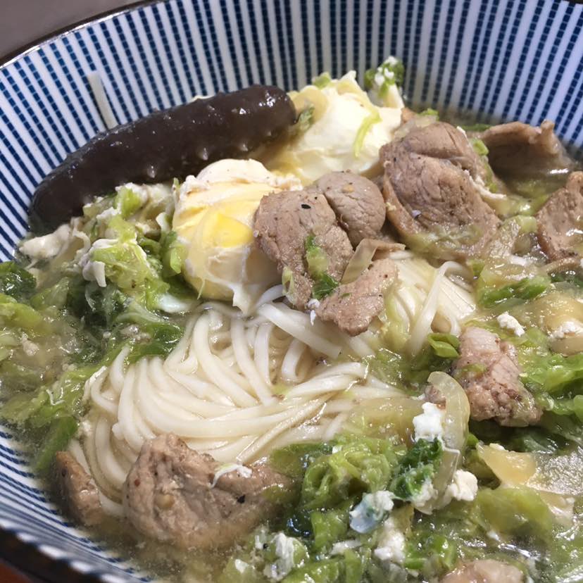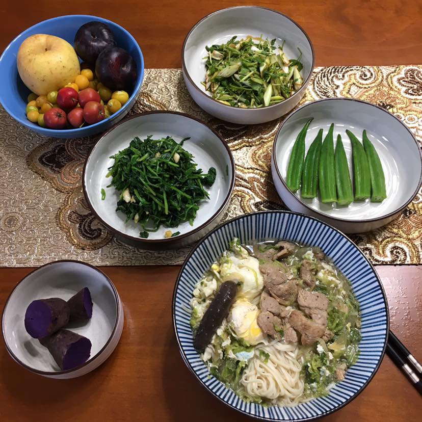 早餐:蒜拌菠菜/白菜海参荷包蛋肉片面/秋葵/紫薯/葱拌香菜/水果