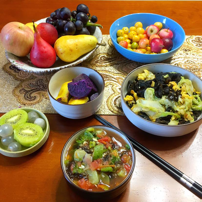 早餐:白菜木耳炒鸡蛋/生菜西红柿黄瓜紫菜汤/南瓜馒头紫薯/水果拼盘