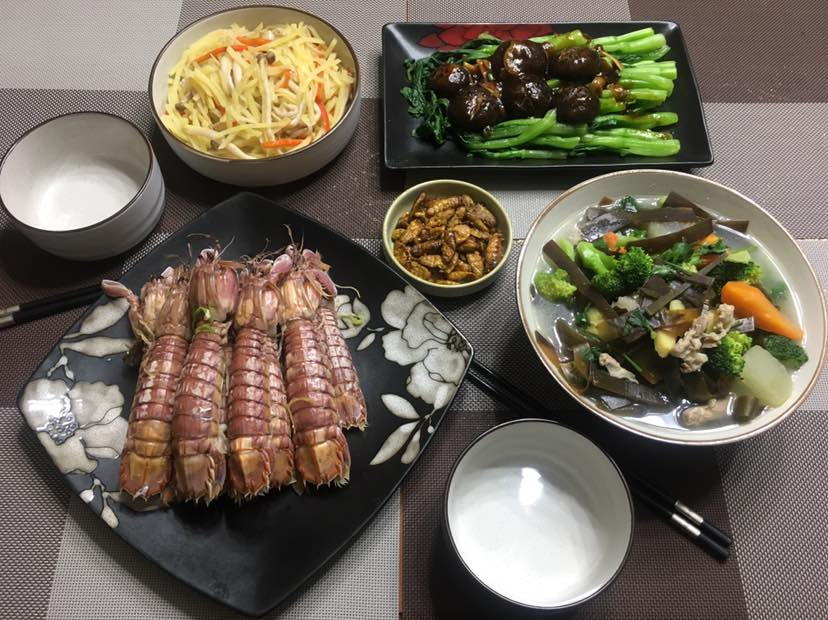 晚餐:皮皮虾/鸡腿菇炒土豆丝/香菇菜心/海带肉片西兰花炖冬瓜胡萝卜/蚕蛹