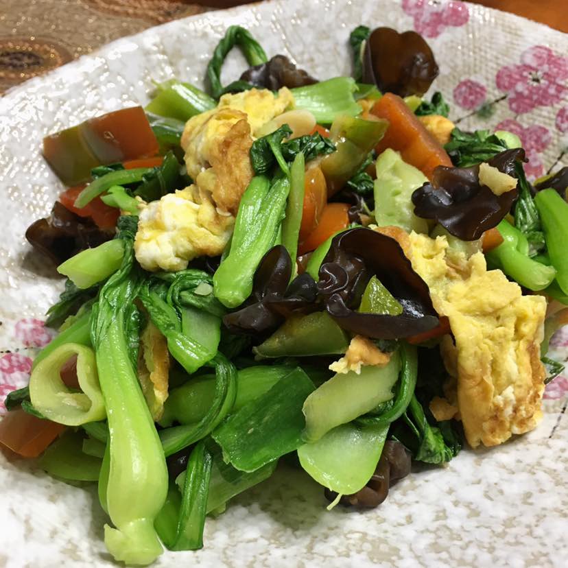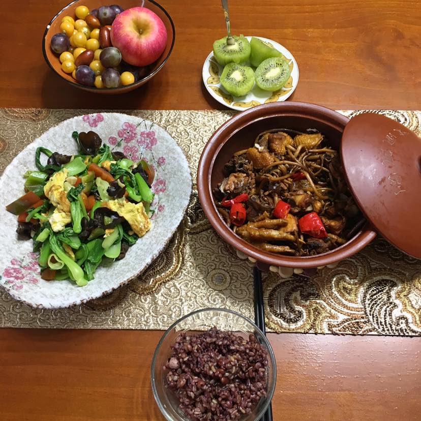 早餐:砂锅茶树菇炖鸡/油菜木耳炒青椒鸡蛋/杂粮饭/水果
