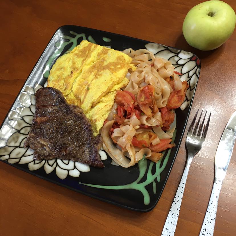 今天早上出去买菜,回来挺晚的,不做那么多花样了。饿!赶紧煎块牛肉煎个土鸡蛋,外加西红柿炒米皮,一顿狂造😄姐妹们:天冷记得照顾好自己和👪哦!