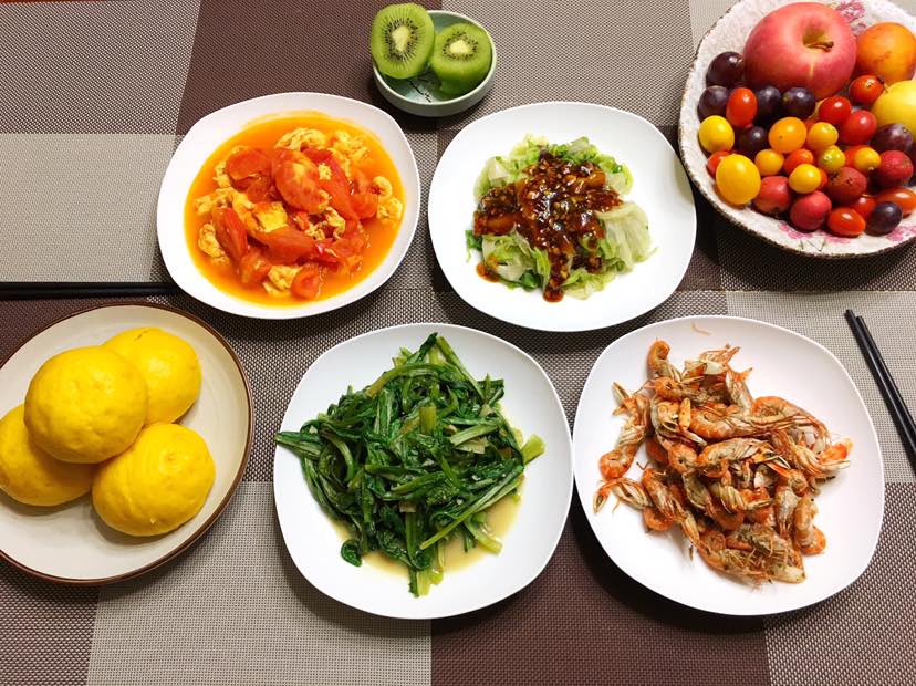 早餐:南瓜馒头/西红柿炒蛋/蚝油生菜/腐乳麦菜/炒海虾/水果拼盘
