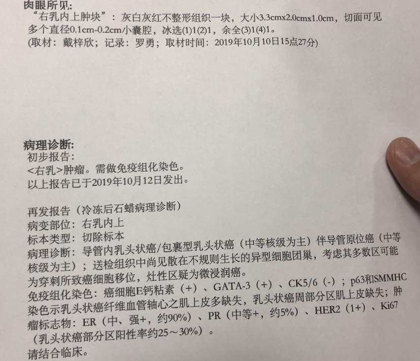 十月全切同时做的一期重建,前哨淋巴结活检,病理报告出来后写了三种癌的名称,太复杂了,楞没看懂了,医生看了就说这个是早早期原位癌,内分泌治疗吃的法乐通,没做放化疗,姐妹们有没有能帮我解释一下这个病理报告的?谢谢!