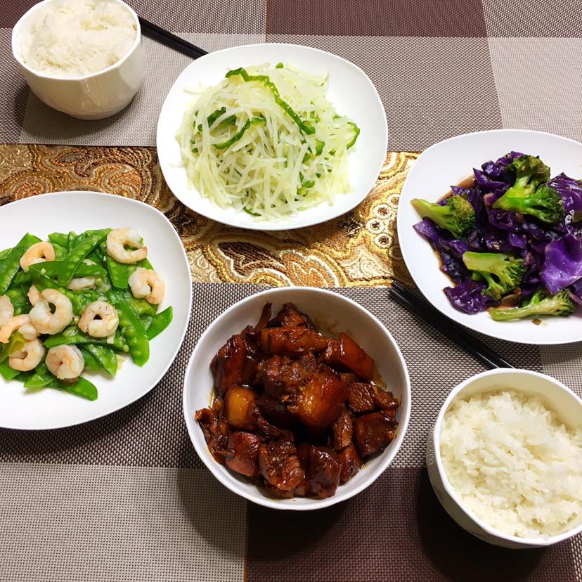 午餐:红烧肉/紫甘蓝炒西兰花/荷兰豆炒虾仁/拌土豆丝