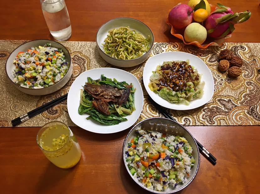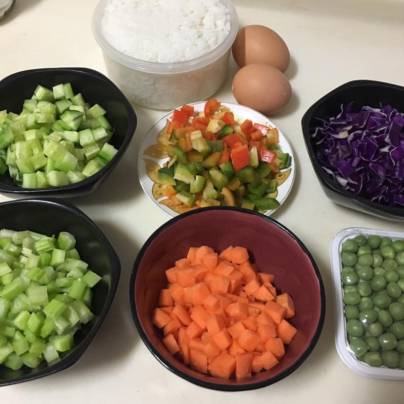 今天打算带饭去上班,昨晚把食材备好,早上起来也不用赶时间啦😄早餐什锦炒饭:胡萝卜/黄瓜/青椒/芹菜/青豆/鸡蛋/紫甘蓝。鲮鱼麦菜/蚝油西生菜/拌青萝卜/柠檬和百香果水