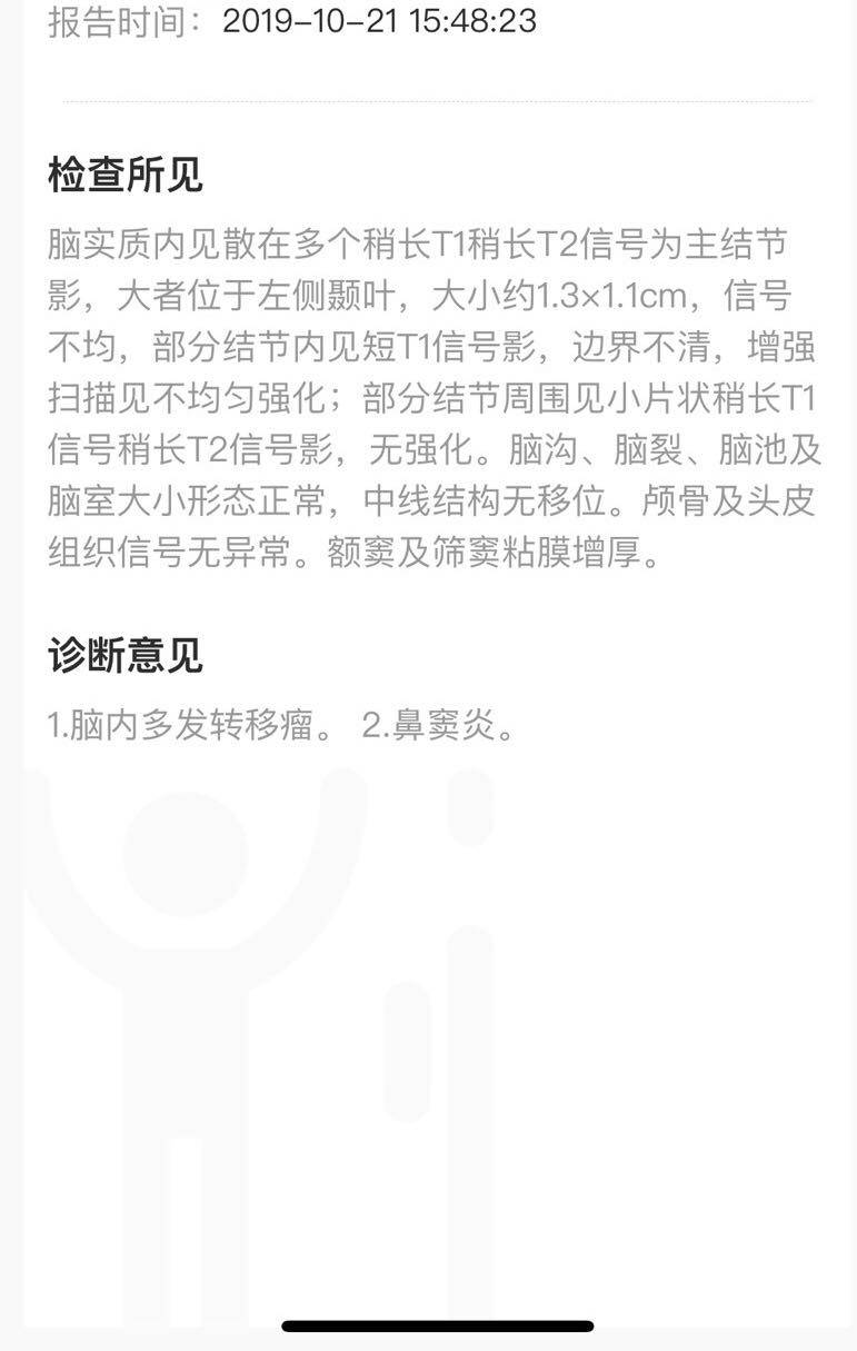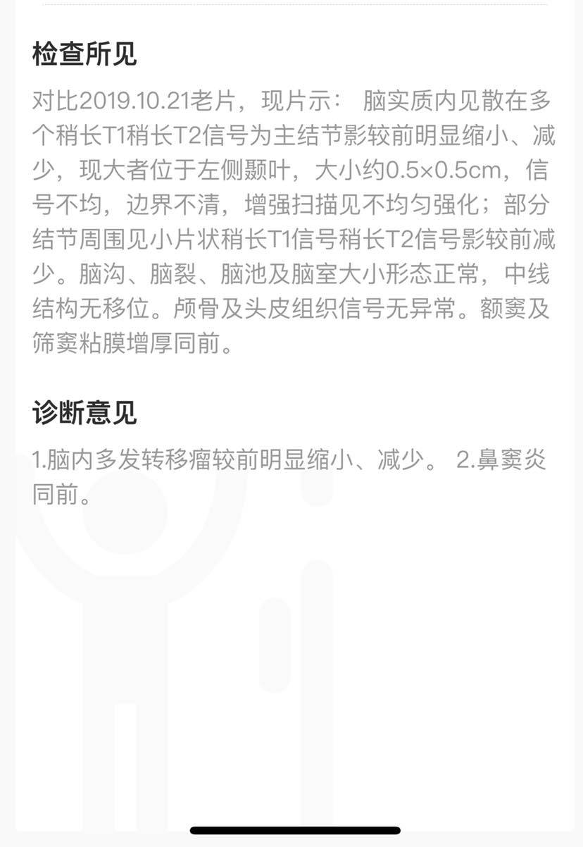 昨天我家爸爸做完了第一次月考,成绩还算不错。之前是初诊就发现多发脑转,一线就用了奥希替尼。话说,真的是一分钱一分货,一直担心对脑的效果不好,结果还算不错,吃药27天,脑部控制得不错👍原发灶暂时没有报告结果,但医生看了片说效果也不错,希望神药继续发挥威力吧!
