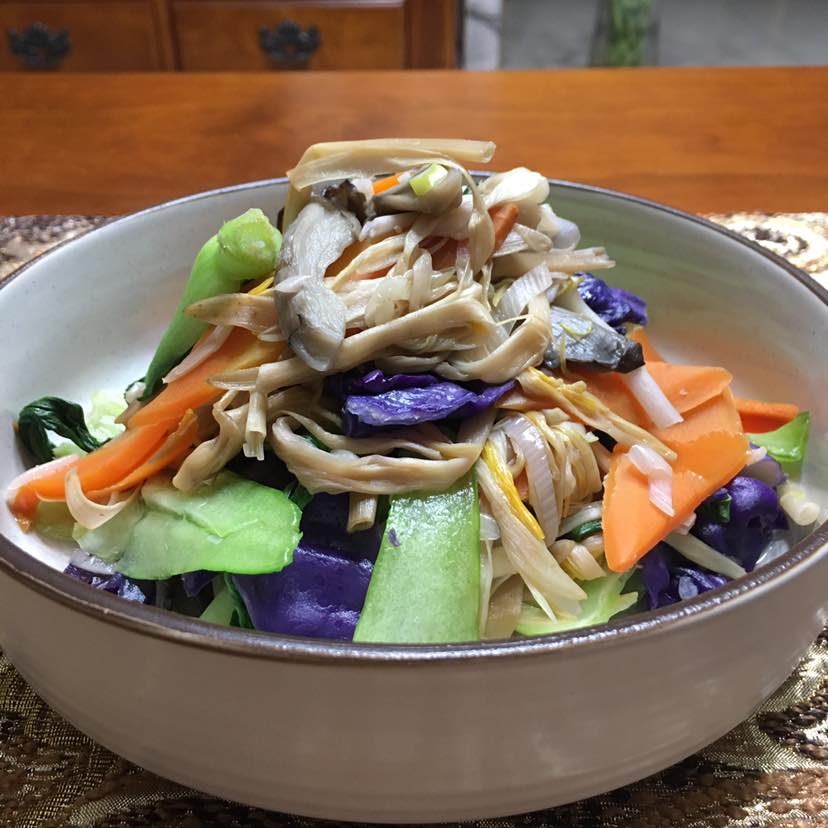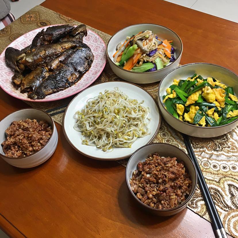 早餐:清炒绿豆芽/什锦菜(平菇/青菜/胡萝卜/紫甘蓝/黄花菜)土鸡蛋炒蒜葱/红烧沙丁鱼/杂粮饭