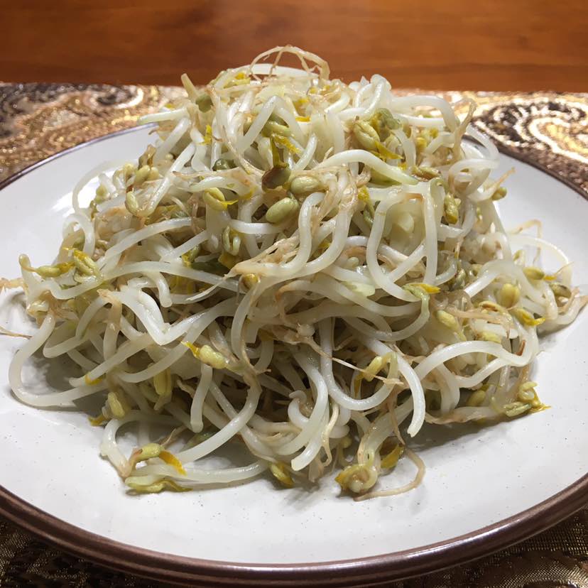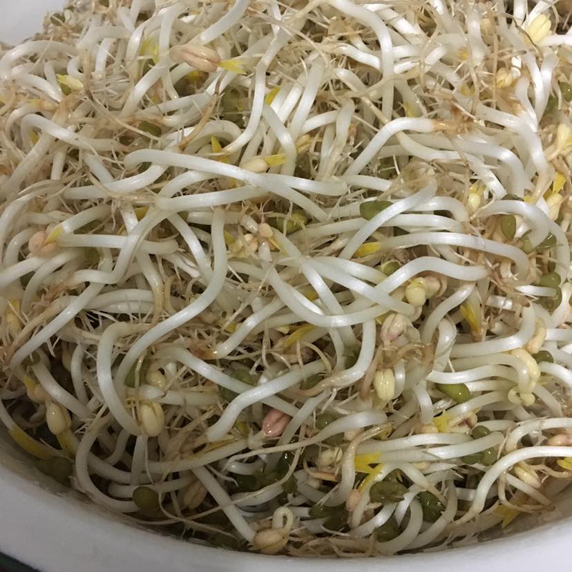 还是小的时候见过妈妈发绿豆芽,自己从来没动手做过。都是去外面买。病后听说外面的豆芽都是用尿素发起来的,也不知道真假,自己很喜欢吃。那就动手发起来。还不错!很简单!把绿豆用清水浸泡一夜,第二天把水倒掉,放上湿毛巾,每天换水2/3次。芽出来以后毛巾上面放点重物压着,这样豆芽粗壮。过4/5天就可以吃啦!