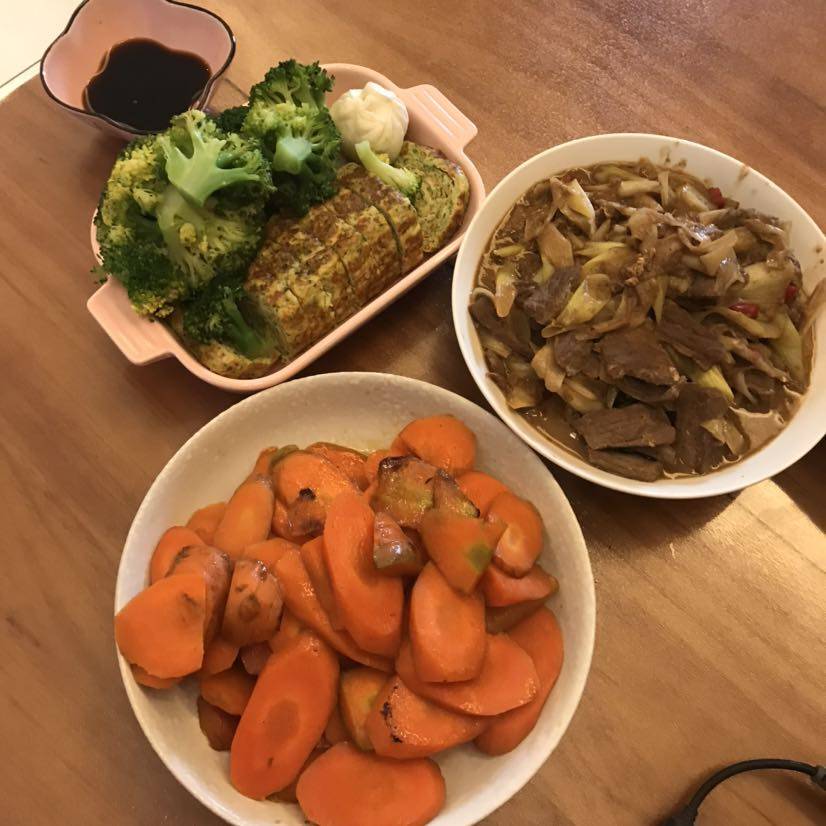 今天晚上,准备飞广东。他一脸委屈,说不想我去。。为哄他,中午给他做了饭,牛肉大葱,胡萝卜,玉子烧。。