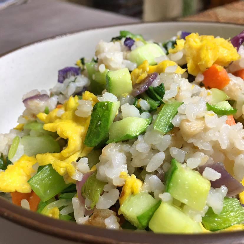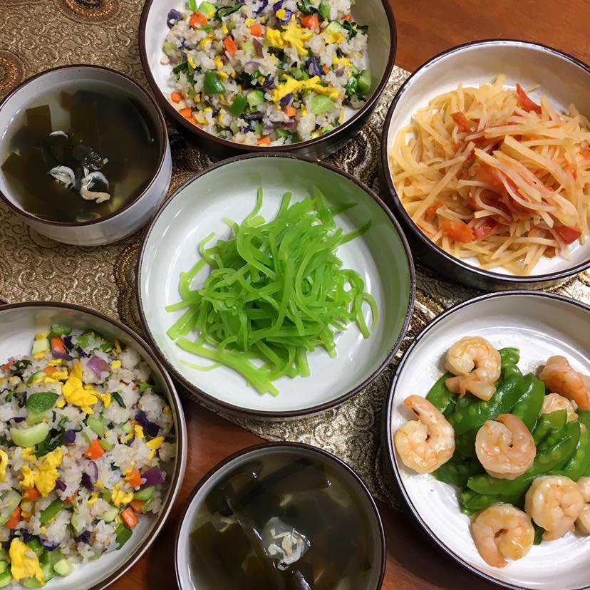 早餐:拌莴笋/虾仁荷兰豆/西红柿炒土豆丝/无油虾皮海带冬瓜汤/什锦炒饭:洋葱/黄瓜/芹菜/紫甘蓝/胡萝卜/杏鲍菇/青菜/土鸡蛋/青椒