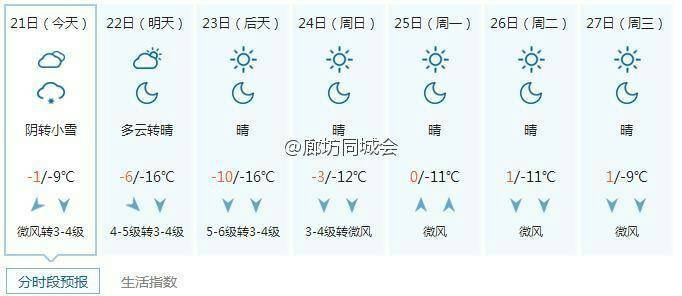 #廊坊生活#【今晚飘雪 明天起风 35年“最强寒潮”降临廊坊】霸气侧漏的冷空气君终于来啦,小同已经彻底被天气预报惊呆:今晚飘雪,明天起风,本周六早晨的最低气温将降至-16℃至-17℃,白天最高温也只有-10℃左右。同时还伴有四五级的偏北风。小伙伴们……记得添衣添衣添衣(重要事情说三遍)!