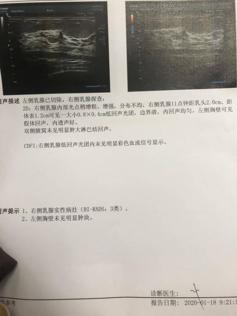 今天做了b超,显示右侧乳腺实性病灶,内心有点担忧😔