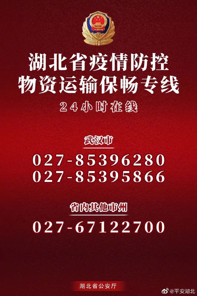 湖北省开通24小时疫情防控物资运输保畅专线,全省公安机关全力护航。武汉市:027-85396280、027-85395866;省内其他市州:027-67122700。