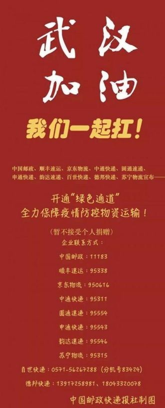 京东物流、德邦快递、顺丰速运,将免费运输全国各地驰援武汉救援物资!电话:950616(京东);13917258981、18043320078(德邦);95338(顺丰)