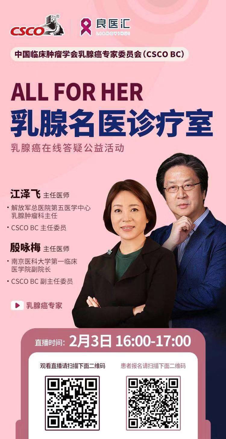 中国临床肿瘤学会乳腺癌专家委员会联合全国100 乳腺癌专家的力量,发起面向全国乳腺癌患者及家属的在线公益答疑项目——“ALL FOR HER 乳腺名医诊疗室”。