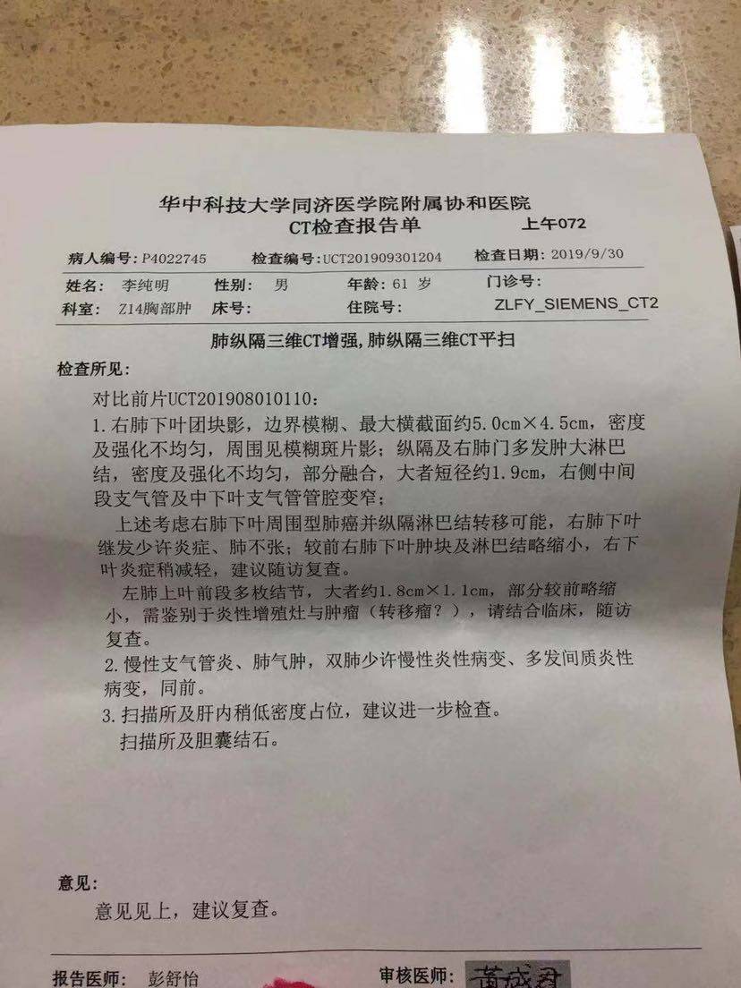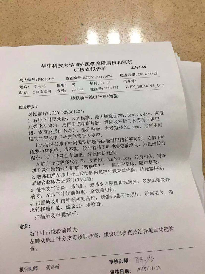 下面三张是老爸三次检查的报告单。最近一次检查是1.13,算是不错的消息,医生说肺上的肿瘤小了不少。