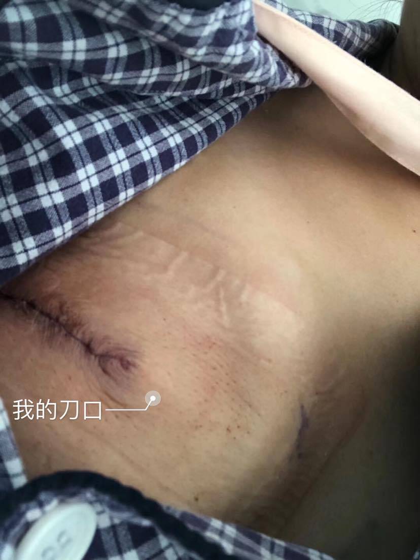 8月14号手术,我的手术体现了好事多磨这个词,通知我是第二台手术,9点把我推进手术室之后,我就一直在等待区域等待,不知道过了多久,副主任过来找我,告诉我推错了,我其实是第三台,没办法,我又被推回了病房,12点半又一次把我推进了手术室,手术做完了,医生把我叫醒之后我第一时间就摸了摸我的胸,咦?平的,难道没重建?我的管床大夫推我回去的时候,我问她的第一句话就是“重建了吗?”“重建了,已经打了150ml的水了,所有都弄的很好,但是…”我说“你有话直说就好了。”“但是乳头没保住。”我就没再说话,我心里想,没保住就没保住吧,心里也没有慌乱,沮丧,或任何的遗憾,悲伤,因为以前我就知道国外有专门的给乳腺癌患者纹身的机构,可以通过纹身去遮盖伤口,或缺损,这样我就可以明证言顺的去纹个身,把它遮一下就好了,这也算是因祸得福吧!再说我的胸,她说已经打了150ml水之后,我才明白我的胸不是一步到位的,是要分阶段注水扩张才能搞定的,这部分过会再聊!