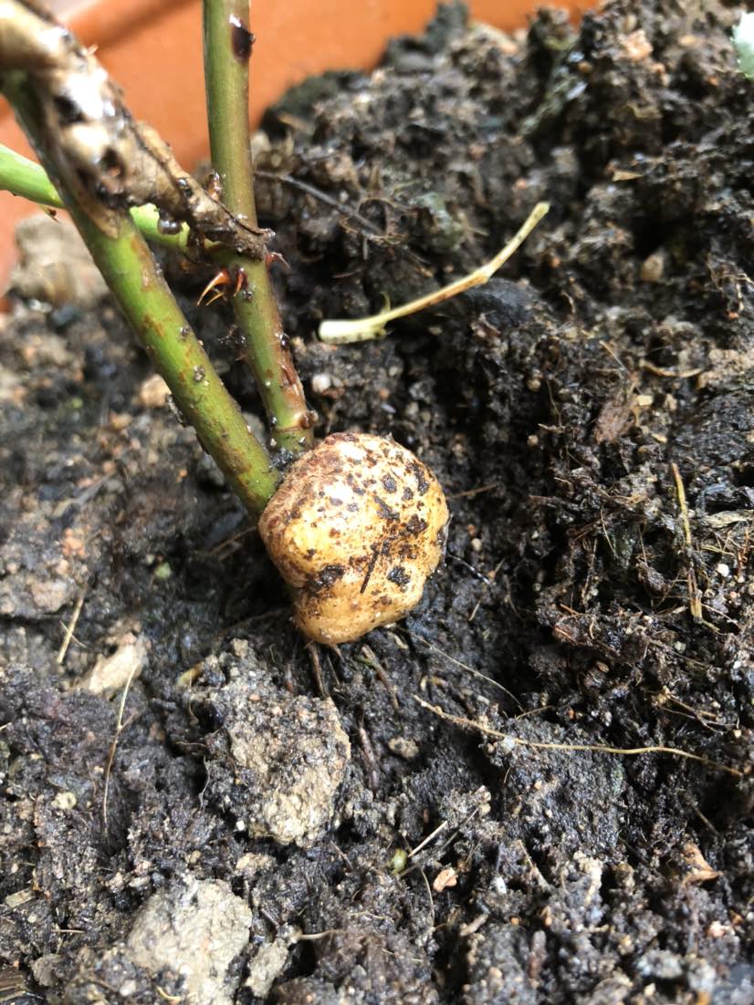 我是去年四月入的花坑,最先是从网上买回了几棵月季,换盆定植后静待花开。有一天发现了异样,夏日花火的根部长出了一个白色的圆形凸起,我慌忙查找资料,不查不知道,一查吓一跳:根瘤病,也叫根癌。谈癌色变,长在人身上如此,长在植物身上亦如此!园艺界对植物根瘤病的处置方法一般是连土扔掉、销毁。我想我怎么就那么倒霉,人得了肿瘤,买棵花回来居然也得肿瘤!也许是同病相怜,我没舍得扔,想试着救一救。在网上搜罗救治方法,居然还真有,准备点说应该是偏方。