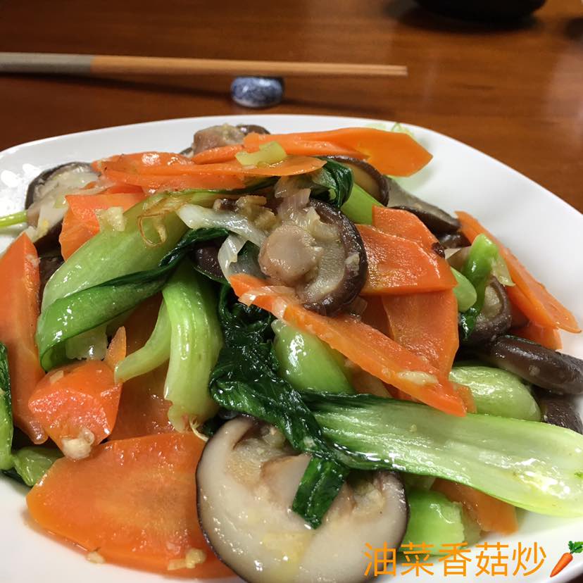 香菇胡萝卜过水,姜葱爆过炒油菜。出锅放点蒜末