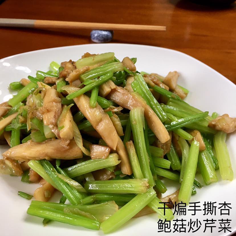 手撕杏鲍菇干煸放酱油调色,然后再放香芹和葱蒜