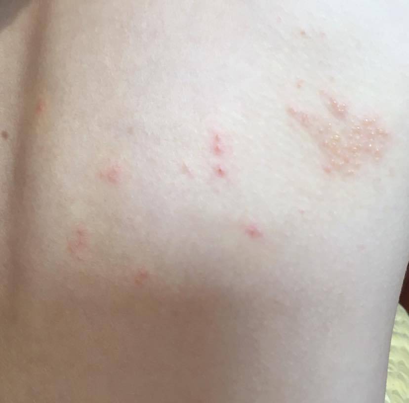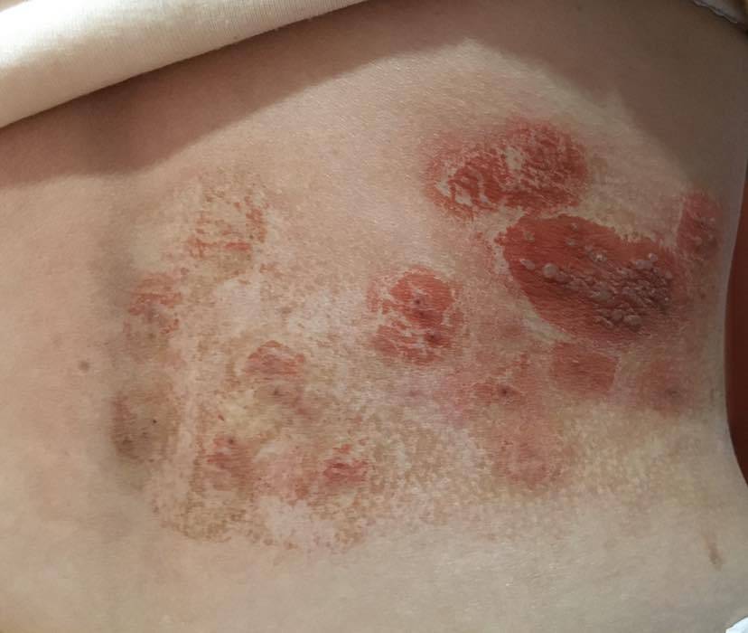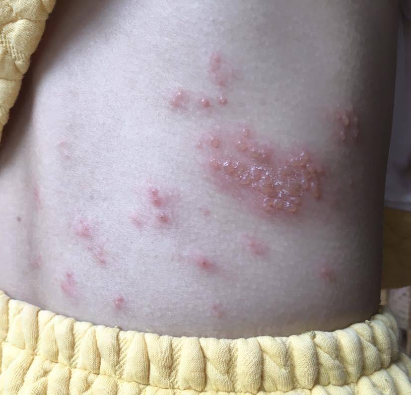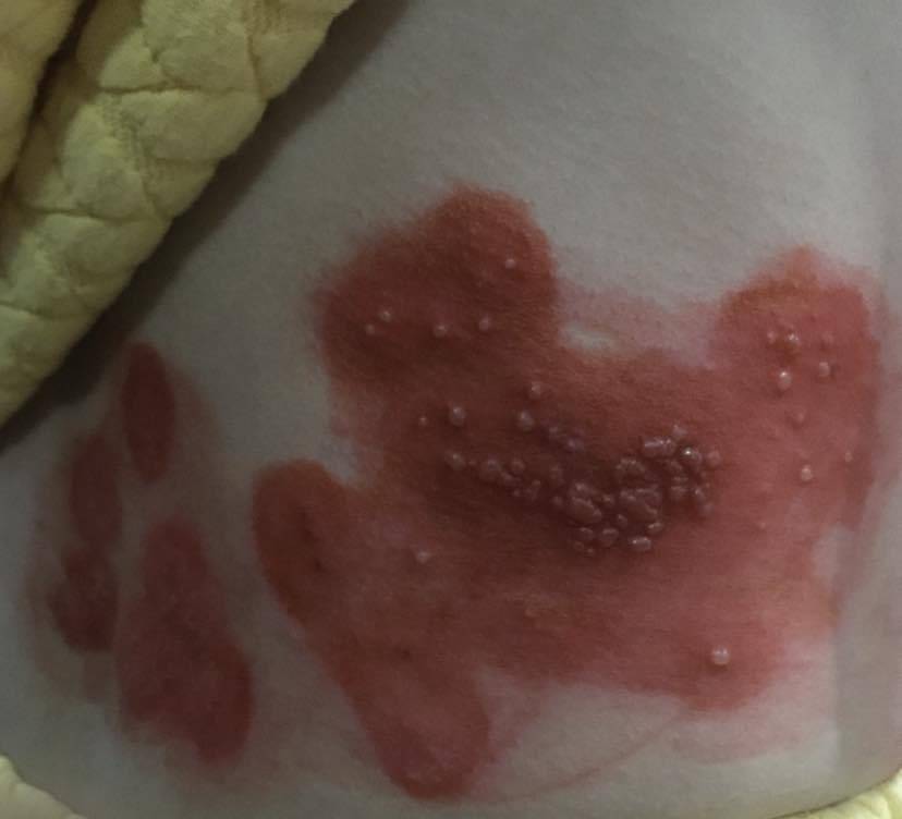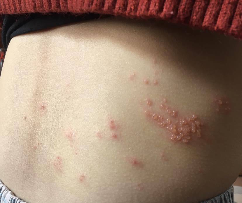 刚开始第一天右腰只是瘙痒有几点红疹,没在意,第二天多了一小簇水泡,因为之前嘴角也长过这些水泡,便觉得擦几天红霉素眼膏就会自动好的,第三天面积变得更大更红了,才赶快去看医生,也没敢跟医生说我有这病,他只开了盒阿昔洛韦吃和阿昔洛韦软膏擦,第四天好像没啥好转,水泡变得更大了,才听邻居的介绍找了乡下一个专门治这种的医生,拿了一瓶药酒擦,开了一些西药吃,才渐渐好点了,昨晚终于能睡个好觉。