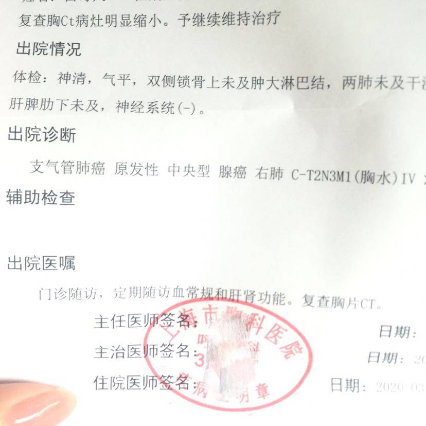 3月16日我们如期到达上海复查,主任开了ct马上查了说肿瘤变小啦,胸水也吸收了很多,让我们继续开药吃3个月再复查,听到这个父亲非常开心,但是我还是要求主任给父亲验血,原来癌胚抗原22现在50了,右侧部分肋骨部分椎体高密度影,医生直接开了出院小结,也说没事,真的没事吗?我好纠结