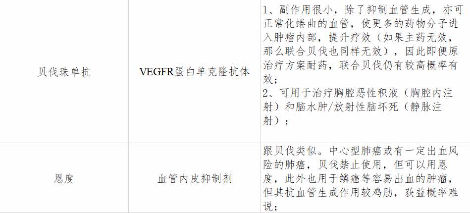 一般而言,贝伐和恩度副作用相对较小,在联合用药(联合化疗、靶向、免疫)方面应用相对广泛一些,且与小分子TKI不同,这两个的作用位点单一,因而疗效也可能相对更好。