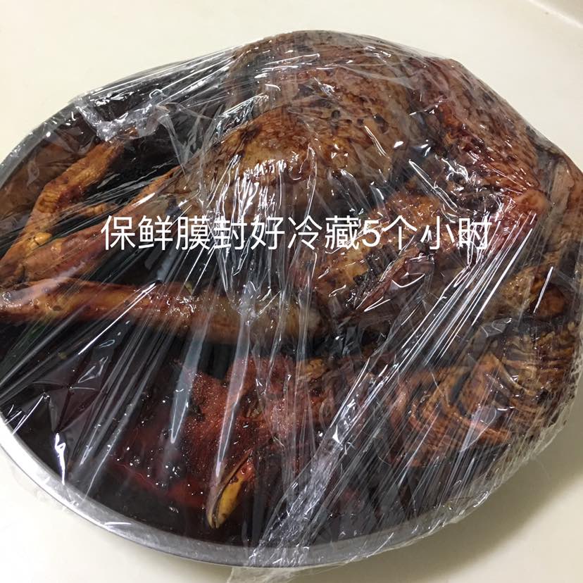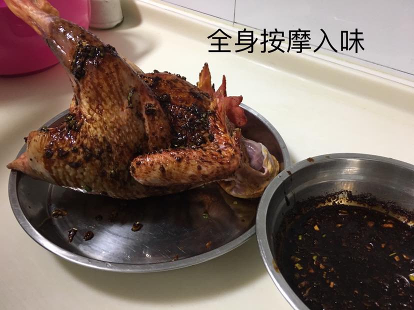 这一步是重点,用料汁给鸡全身按摩至完全吸收,我大约按摩20分钟,时间越长越好,越入味。