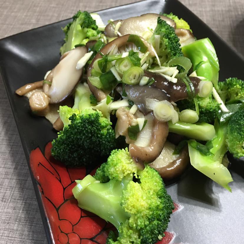 香菇拌西兰花,香菇和西兰花焯水后捞出,放冷水浸泡捞出沥干水分,加入葱花和蒜末,适量盐和橄榄油拌匀即可。