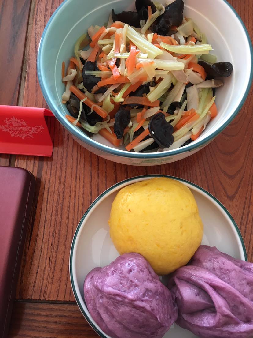 快到中午,老板要请我吃面🍜我说:得了吧!给你省点钱,俺回去吃我的营养午餐啦😄回到公司把我的紫薯花卷和南瓜馒头热好,搭配我的营养大拌菜一顿狂造😄