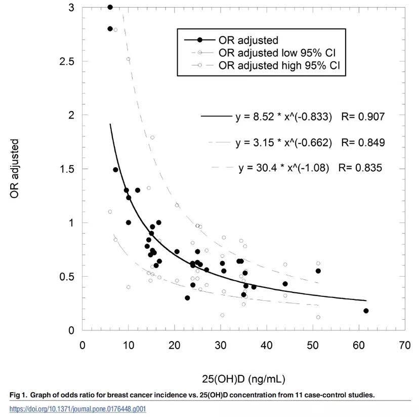 多个观察性研究得出维生素D水平与肿瘤发生呈负相关的结论,包括乳腺癌、结直肠癌、肾癌、肺癌、胰腺癌、消化道肿瘤和总体癌症发生率。在一篇维生素D水平与癌症发生率的综述文章中,William B. Grant总结了11个病例对照研究,得出了维生素D与乳腺癌发生率关系的R值为0.907。