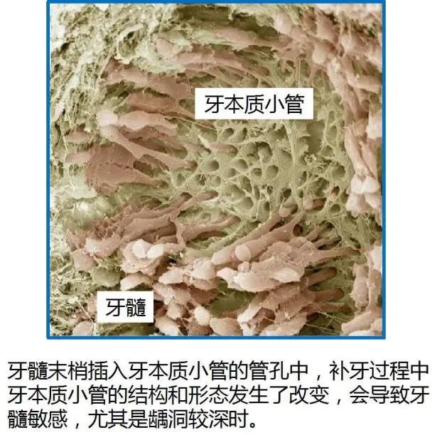 ⑥ 补牙后牙齿敏感:补牙后的牙齿敏感,通常是牙本质小管的结构和形态发生了改变而导致(如图),这好像脚穿进鞋里、鞋子受挤压变形,脚会疼痛难受一样。