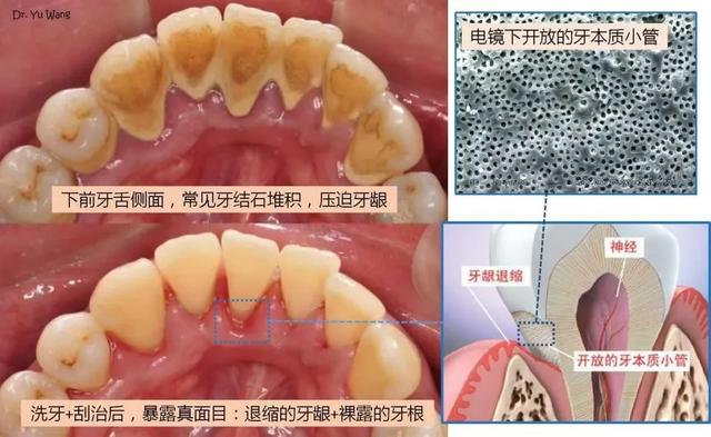 近期进行过牙科治疗:洗牙、龈下刮治、牙冠修复等,这些治疗可能会导致暂时性敏感,通常4至6周内消失;最常见的是在洗牙、刮治后,长期沉积于牙根面的牙结石被去除,牙根面暴露(如图),引发根面牙本质敏感;通常在治疗后1周内,敏感最为严重。
