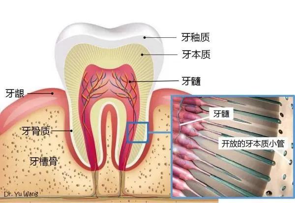 但是,如果牙釉质磨损或牙龈退缩,牙本质则会暴露出来。牙本质内含有成千上万个与髓腔相同的小管道,这些管道使刺激(温度、冷热、化学、酸甜以及机械作用、磨擦探触等)直达牙髓(牙神经),从而导致疼痛。