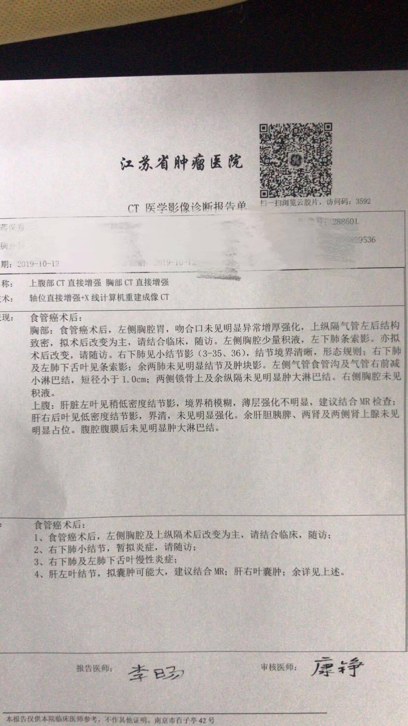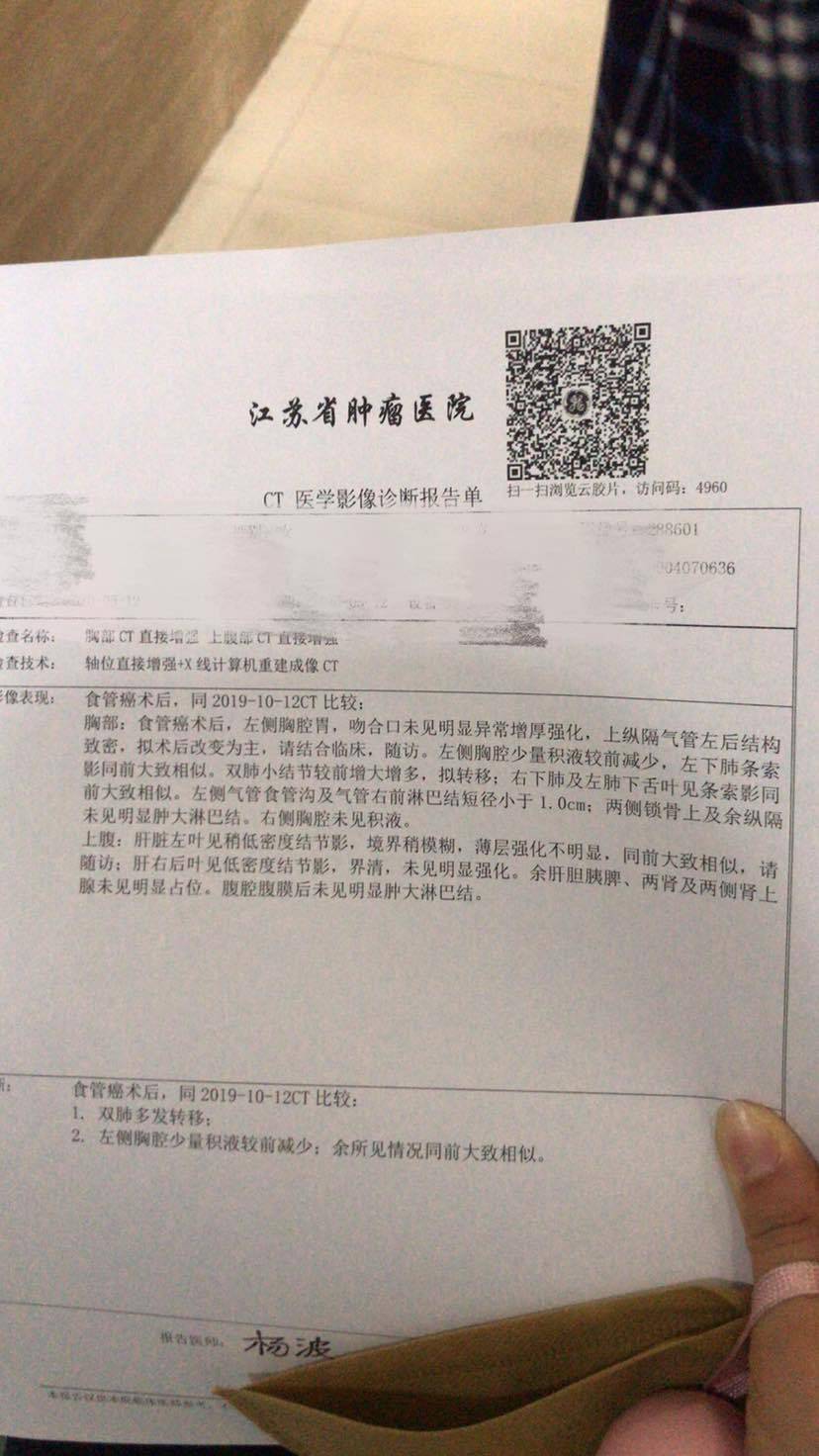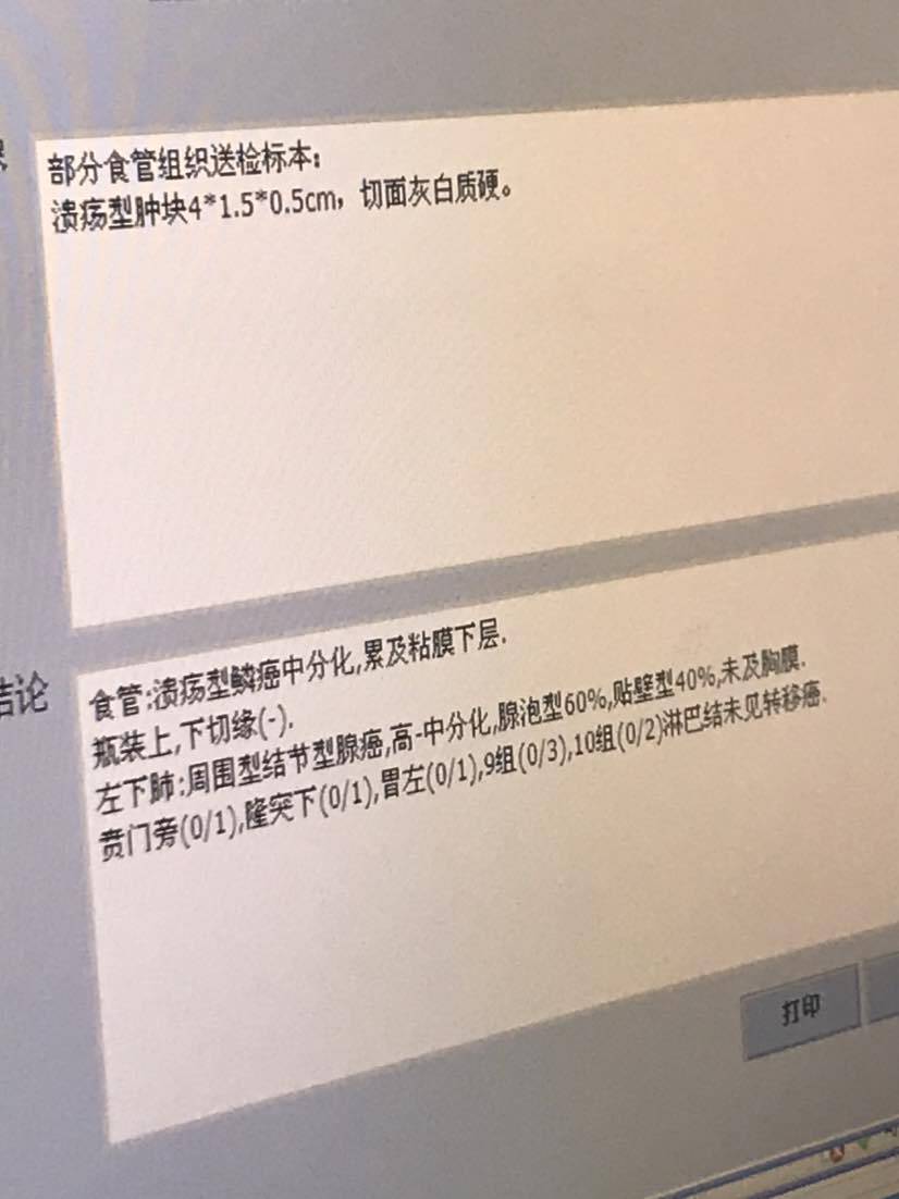 一年不到的时间,医生也觉得比较快,主刀医生和一个胸外科的医生认为肺腺癌复发,推荐我们做肺的基因检测,另一个呼吸科医生觉得当初的肺癌病理不严重,反而食管癌当初应该算2期,我们是累及黏膜下层,所以主张食管癌转移,推荐我们做食管+肺+血液三项基因检测。