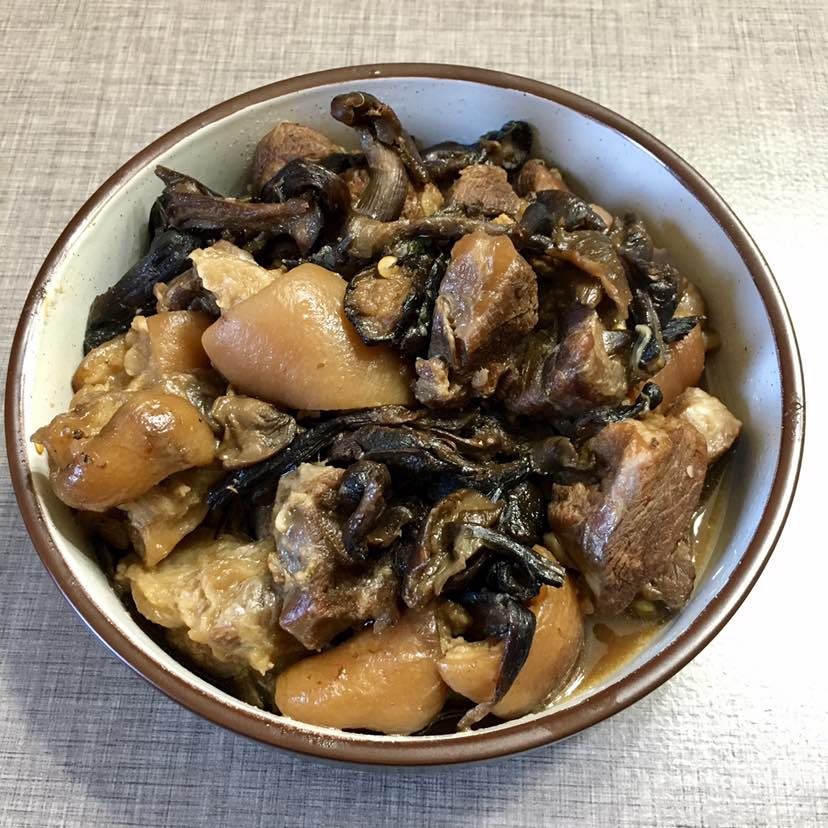 肘子烧东北野生臻菇,我买的是土猪肉,把肘子的骨头剔出去,把肉切块放入凉水锅焯水,水开后肉变色捞出洗干净备用,臻菇是干的,提前泡好。锅中倒入适量油,放入姜葱和花椒炸香,放入肉块翻炒,加入适量料酒和酱油炒均匀。加入适量的水和泡好的蘑菇后,放入高压锅里压20分钟,自然排气后加入适量的盐就可以吃了😄