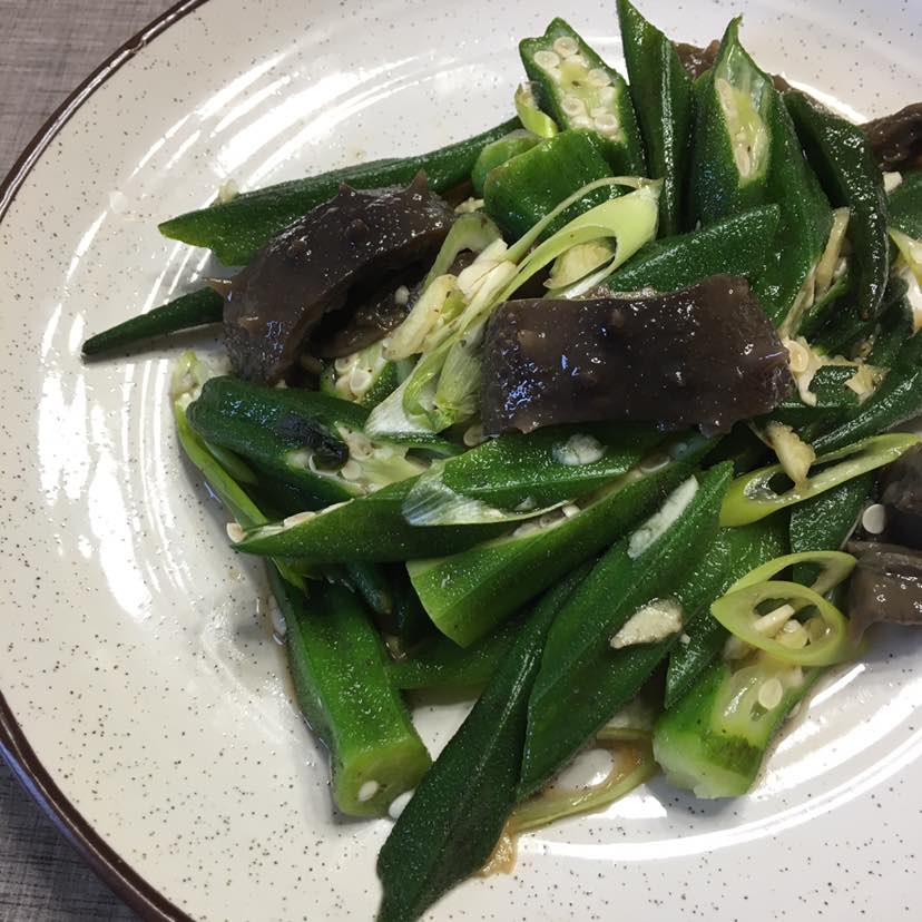 秋葵拌海参,这是我的菜嘻嘻😁这样吃也是我的独创,把秋葵炒水后捞出,过凉水沥干水分,切滚刀,海参切段,再放入葱白。葱白是精华😄加入适量的蒸鱼豉油拌匀就好,简单省事儿。