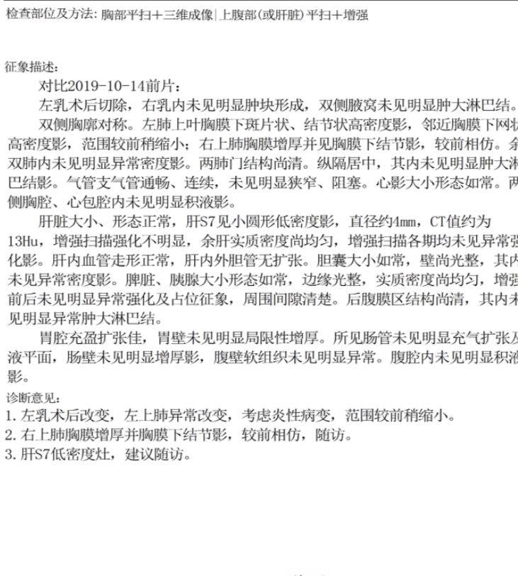 术后一年余主动让医生开的CT及钼靶检查,刚手机上看到结果,心脏蹦蹦蹦地跳,这样的检查结果似乎不太尽如人意!